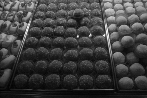 engarrafada, arranjada simetricamente nas estantes.